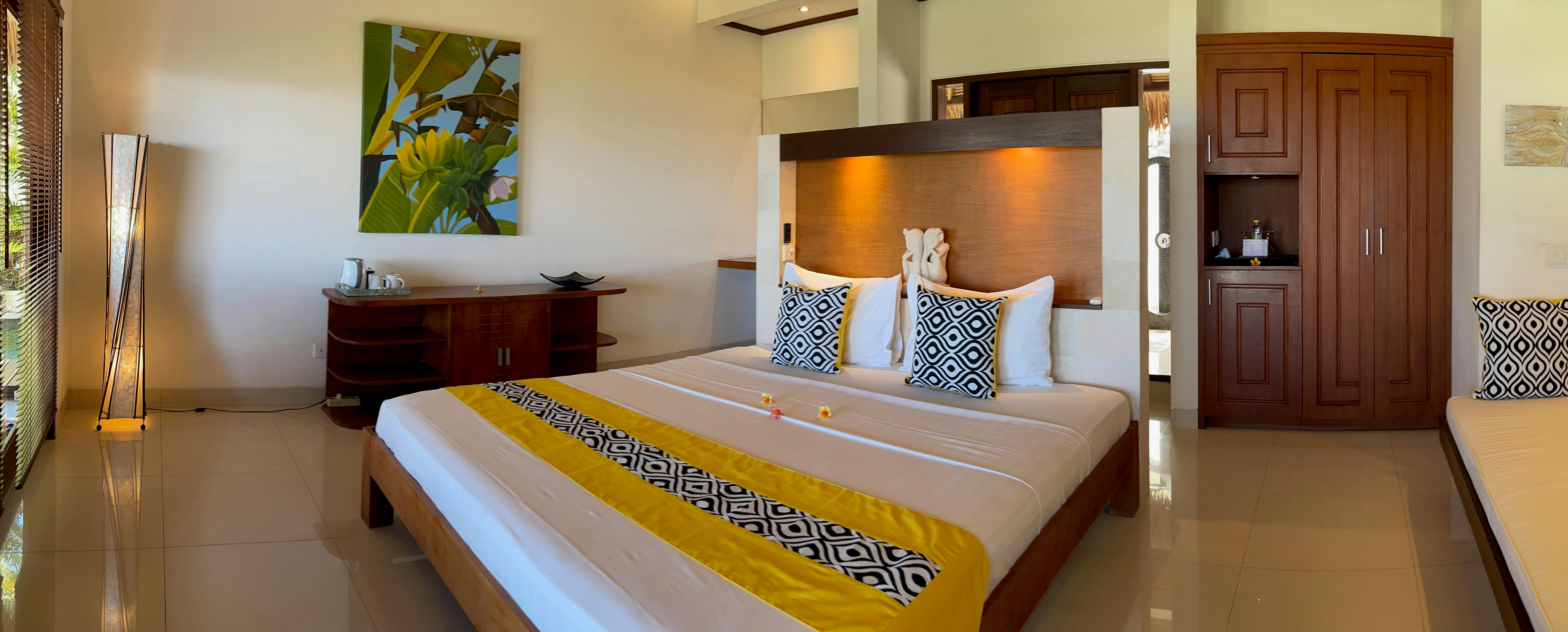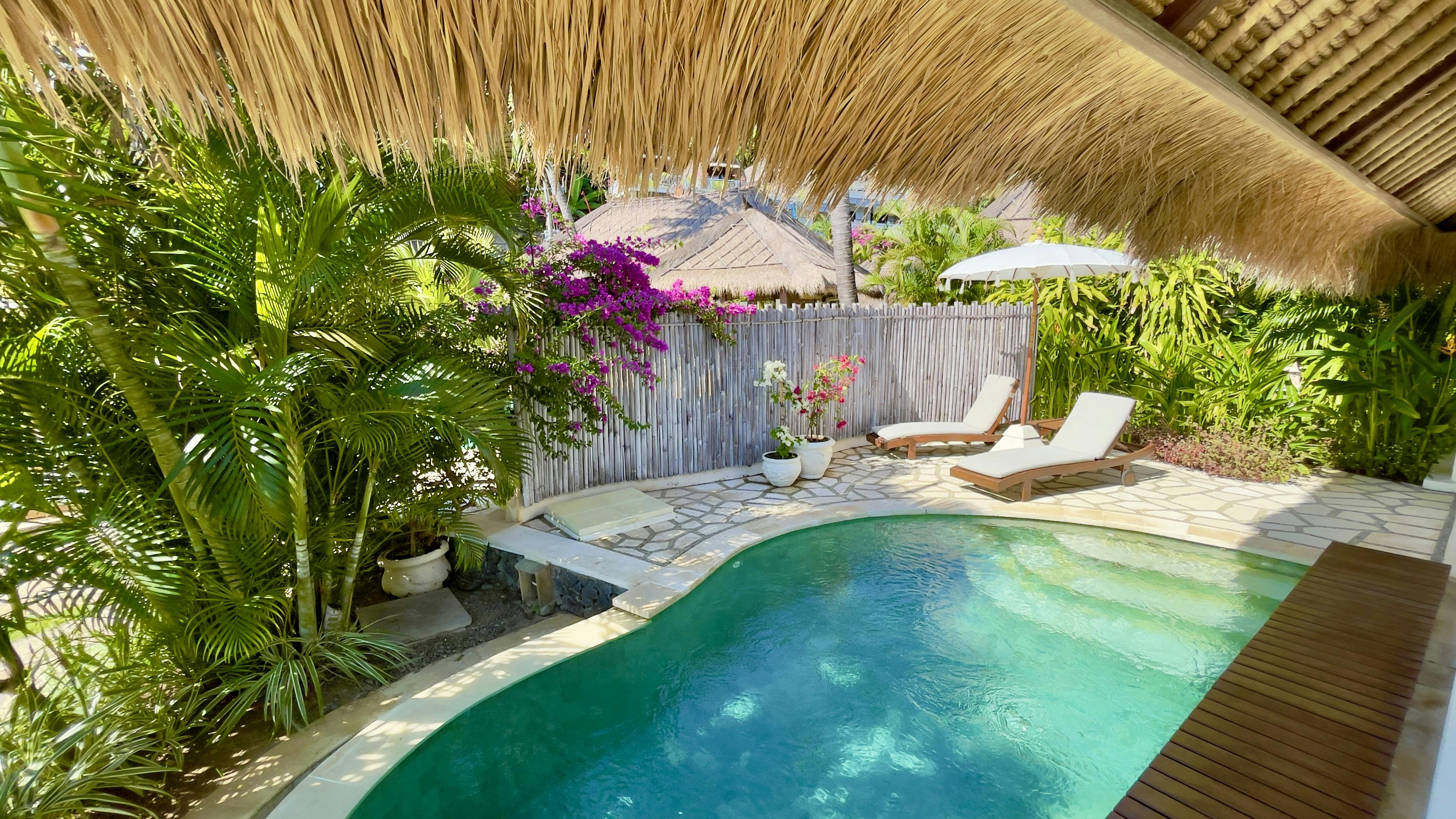Dans un emplacement privilégié situé sur la plage, le bungalow a sa propre piscine avec ponton privé, pelouse privée directement accessible depuis la terrasse, qui est équipé d'un canapé en rotin et deux chaises longues. Les lève-tôt peuvent être récompensés par un lever de soleil spectaculaire. Le bungalow impressionné par le design lumineux du salon spacieux et dormir, qui est équipée d'un lit king-size, armoires et une coiffeuse. La chambre dispose d'une baie vitrée avec canapé-lit intégré qui peut servir (en supplément) comme un lit pour une troisième personne. La salle de bain semi-ouverte avec une douche à effet pluie.