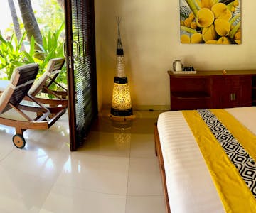 Les cinq bungalows jardin offrent une vue sur le jardin et en partie sur la mer. Les chambres lumineuses et modernes sont meublées avec des meubles en teck confortable et art autochtone. Chacun des bungalows jardin dispose d'un coin salon et la chambre spacieuse, une salle de bains privative et d'une grande terrasse avec table, chaises et deux chaises longues. Les chambres sont équipées d'un lit king-size, une armoire et une coiffeuse et une baie vitrée avec lit intégré de jour qui peut également servir de lit pour une troisième personne (payant). La salle de bain semi-ouverte avec une douche à effet pluie.