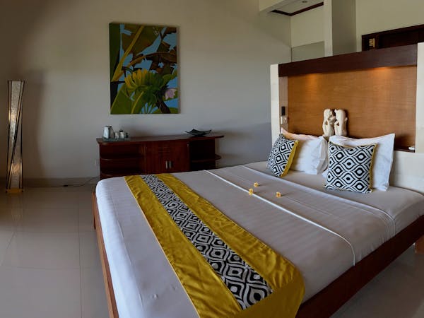 ビーチビュー デラックス ルームは、リゾートで唯一の 2 階建ての建物の上層階にあり、2 つの独立したベッドルームに 3 名様まで宿泊できるため、小家族に最適です。マスターベッドルームからは、ゆったりとくつろげるキングサイズベッドから素晴らしい海の景色を眺めることができ、小さなベッドルームにはシングルベッドが備え付けられています。マスターベッドルームにはデイベッドが組み込まれた出窓が組み込まれています。半屋外の専用バスルームは両方のベッドルームにあり、2 つのシンクとハンドヘルド オプション付きのオーバーヘッド レインシャワーが備わっています。テラスには籐製の椅子と 2 つのサンラウンジャーがあり、湾の雄大な景色と壮大な日の出を楽しむのに理想的な場所です。